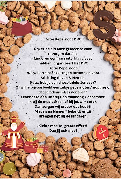 Vorig jaar was ‘Actie Pepernoot’ een groot succes en hebben we namens DBC veel kinderen blij kunnen maken. Dit jaar gaan we de actie weer een vervolg geven. Kleine moeite, groots effect! Doe jij ook mee?